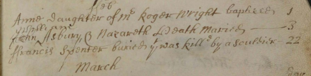Late last night it occured to me to search the parish registers to see if the Man that was Kill’d could be identified. There, in the register of St Chad’s church, is an entry on the 22nd February 1691 for Francis Spencer, accompanied by the note, ‘was kill’d by a souldier’. This surely must be the victim. What happened to the body of Richard Cromwel after he was taken down from the gallows on the London Road is something of a mystery however. St Michael’s seems the most likely place for him to have been buried as the register there records several others who met the same fate but there is nothing relating to Richard Cromwel. I shall continue to search in the hope I can add this final chapter to the sad story of the so-called Happy Sinner.