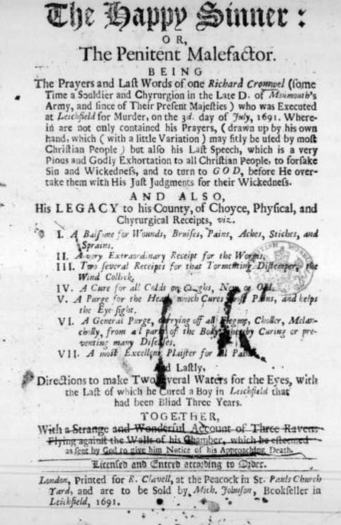 On 3rd July 1691, army surgeon Richard Cromwel was executed in Lichfield for murder. A publication featuring his final prayers and pre-execution speech was sold by Michael Johnson, the bookselling father of Samuel. As a bizarre bonus, the book entitled, ‘The Happy Sinner; or The Penitent Malefactor’, also included Cromwel’s legacy, in the form of several remedies for ‘ills of the flesh’, including worms, wounds and wind. I’ll link to an online copy of the book in the comments but please do not try them at home folks.